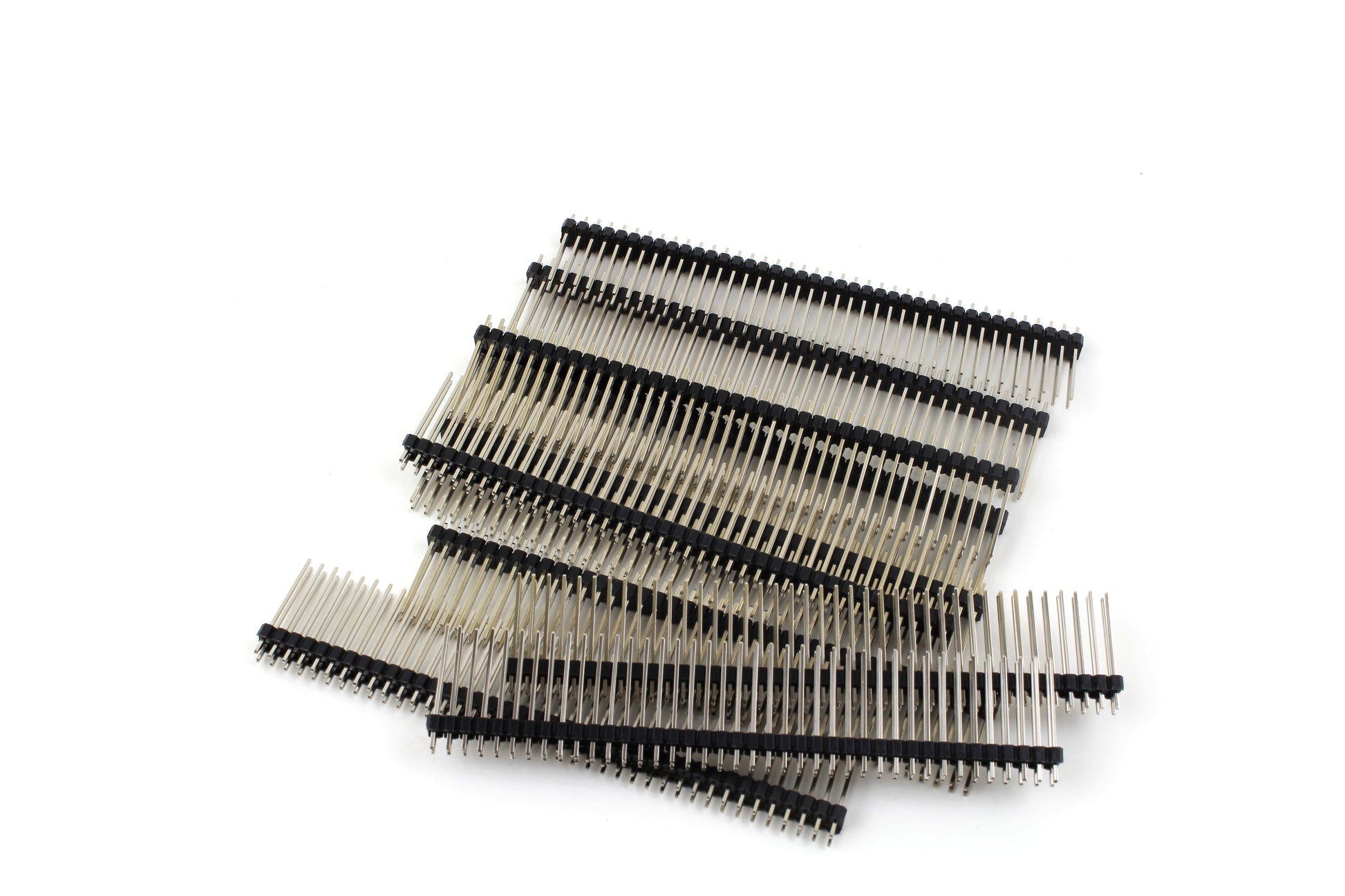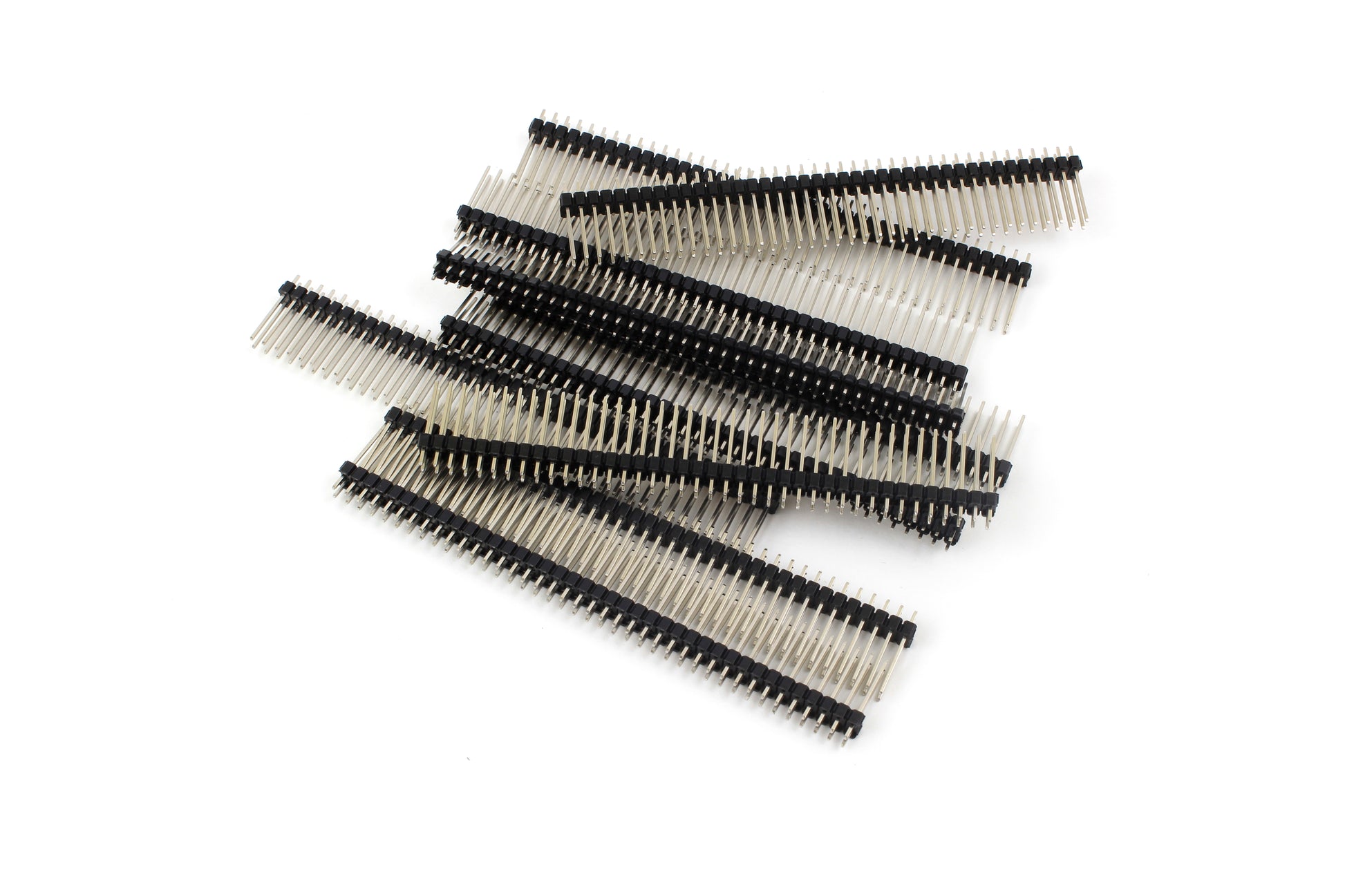 These male headers are exactly what one would expect. With this set, you'll have enough pins for all of your electronic projects! The spacing, or pitch, between the pins, is 2.54mm or 0.1inch. This is also commonly referred to as "100 thou". With this standard North American pitch, these male headers can be used in prototyping boards, Arduinos, breakout boards, and many other common DIY projects.